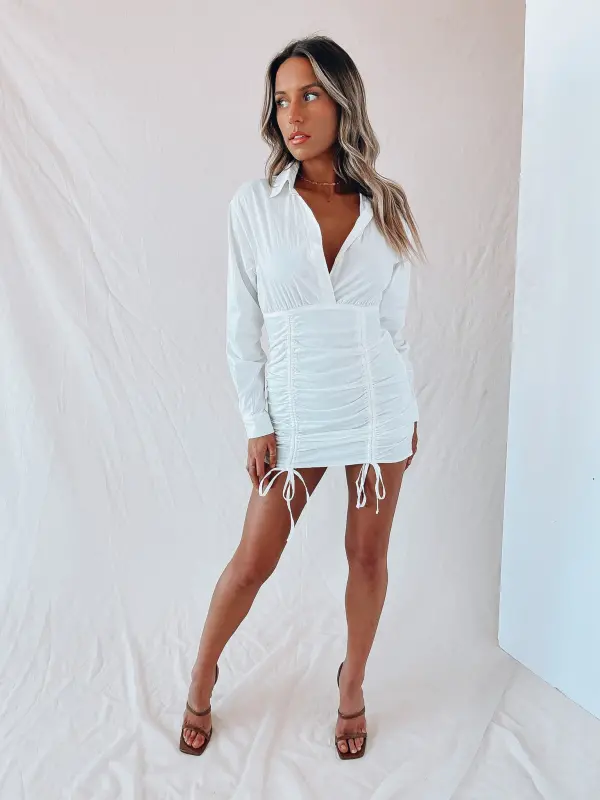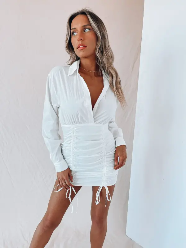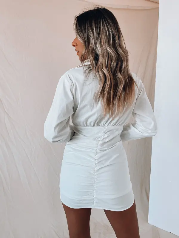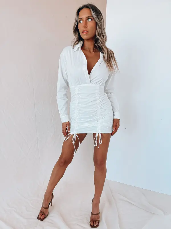 Features: Long sleeve, collared, adjustable self-tie cinch detail, side zipper closure, fitted silhouette