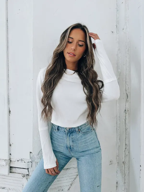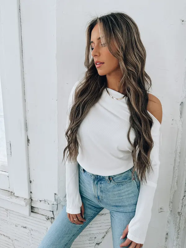 Our Danny OTS Bodysuit is a white ribbed bodysuit features a straight off the shoulder neckline. This bodysuit has a loose fit throughout the bodice and is completed with fitted long dropped sleeves with exposed seasms, thumb holes, and snap closure. This bodysuit is made of a stretchy lightweight material that that provides a figure flattering fit.