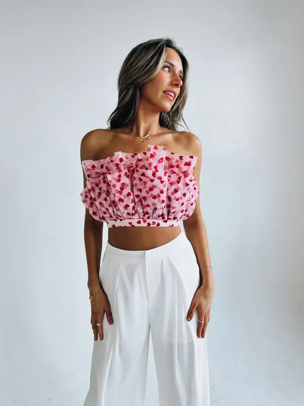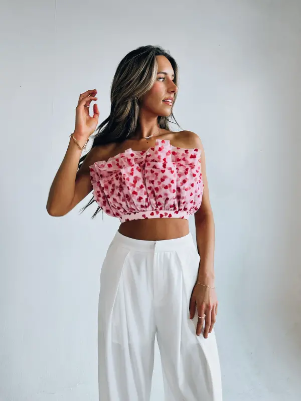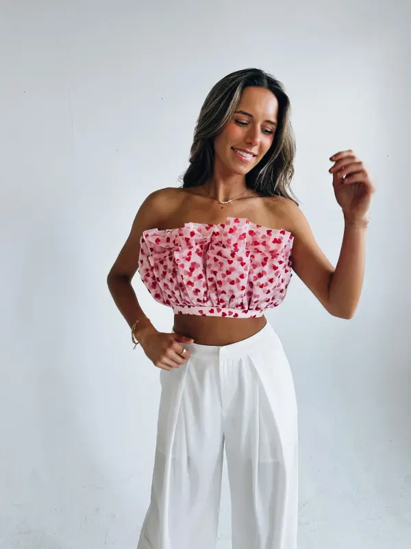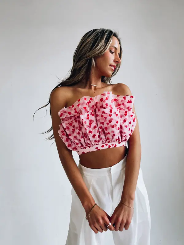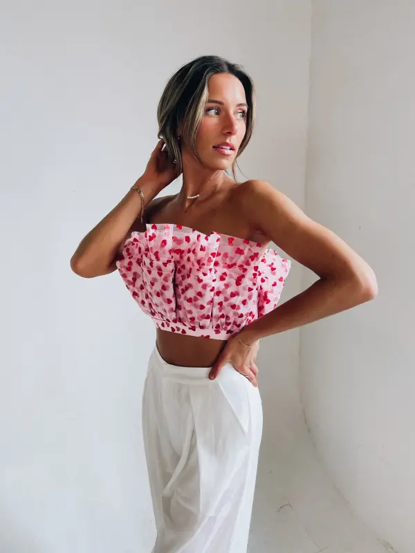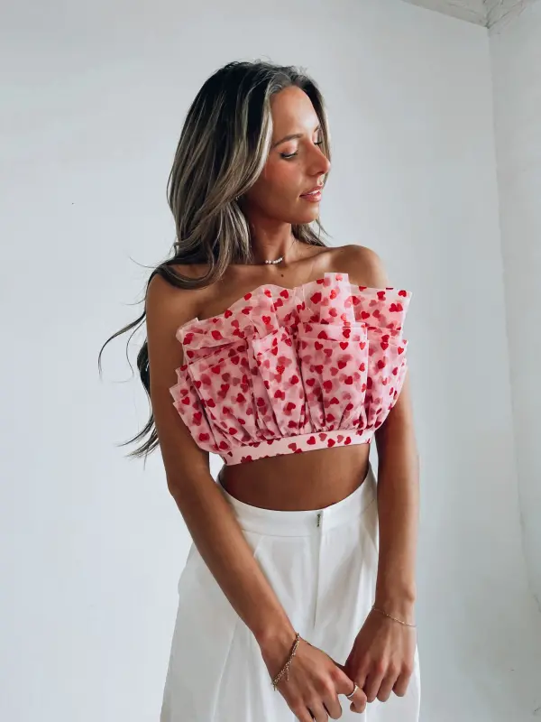 Our Follow Your Heart Top is the festive top you need for any of your Valentines Day plans. This tiered strapless organza top is loaded full of unique details that make this top a total stand out. This top is made of a tiered baby pink organza with red sparkle heart design all throughout. This top is fully lined and is completed with a thick elastic hemline, hidden zipper and hook and eye closure in back, as well as a no slip grip along the neckline. This top has stretch throughout and is true to size but if in between sizes we do recommmend sizing down.