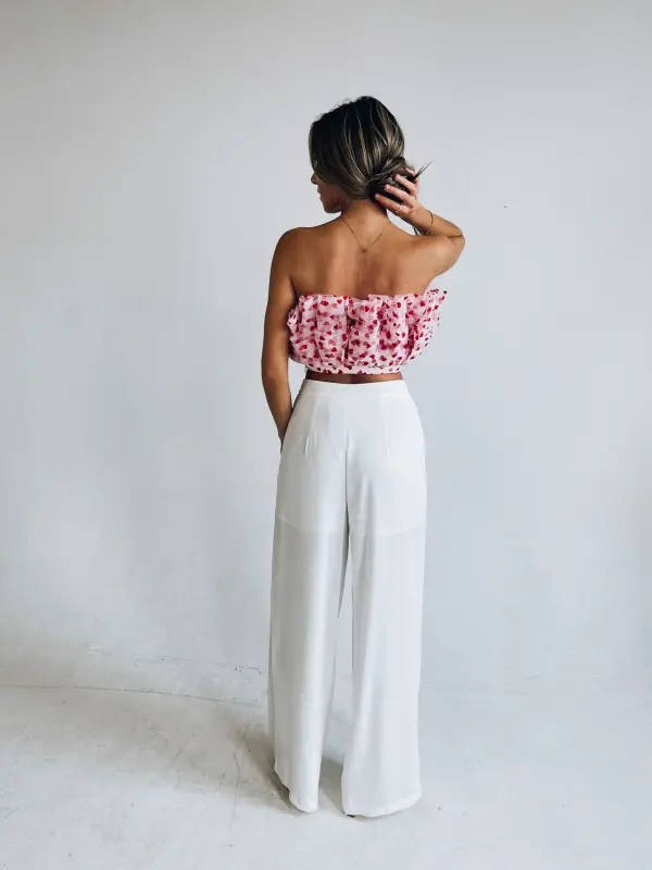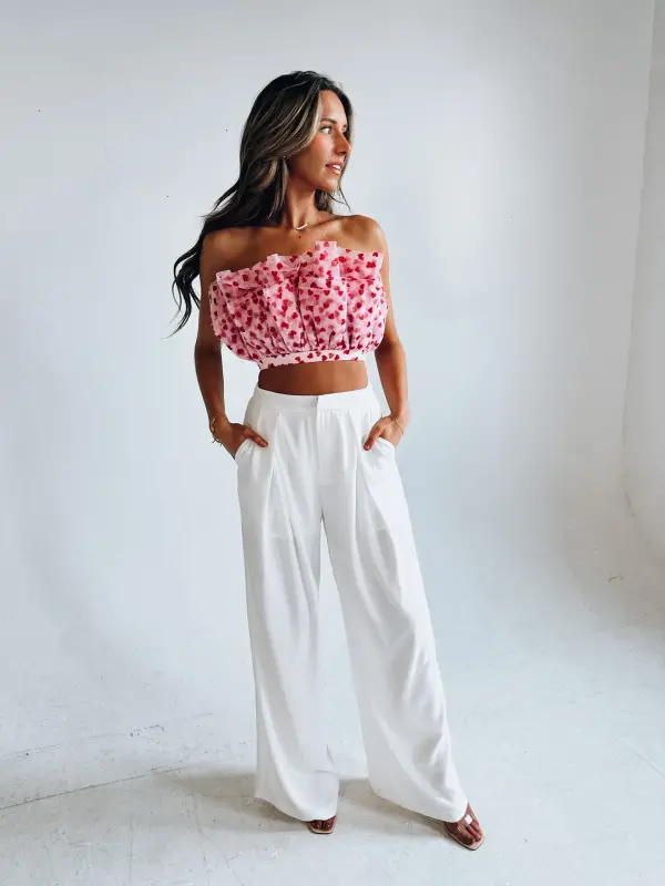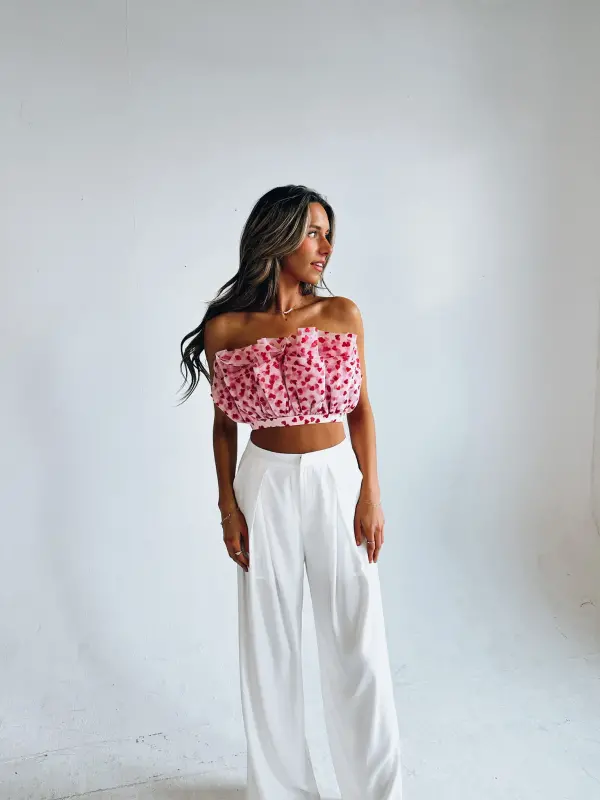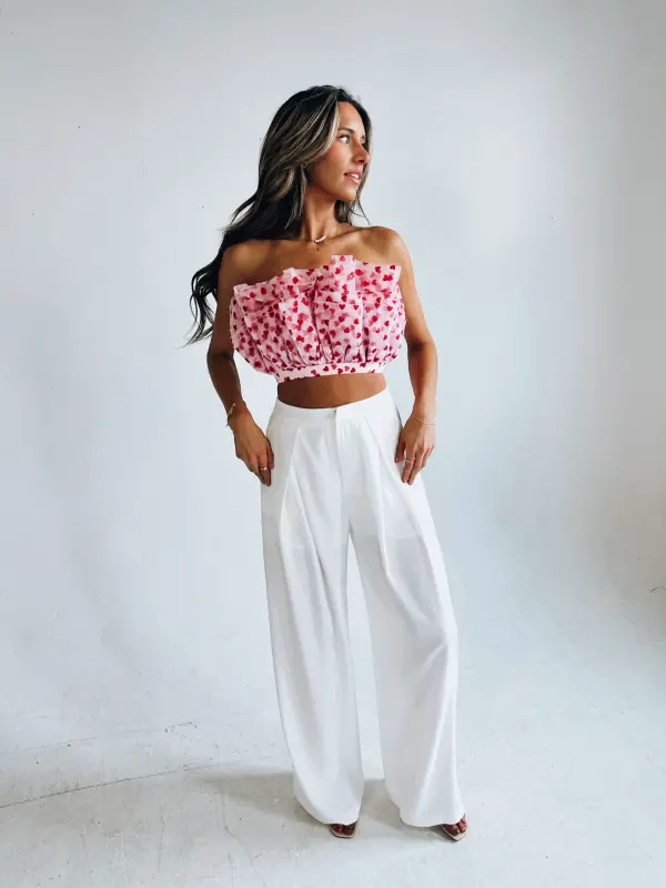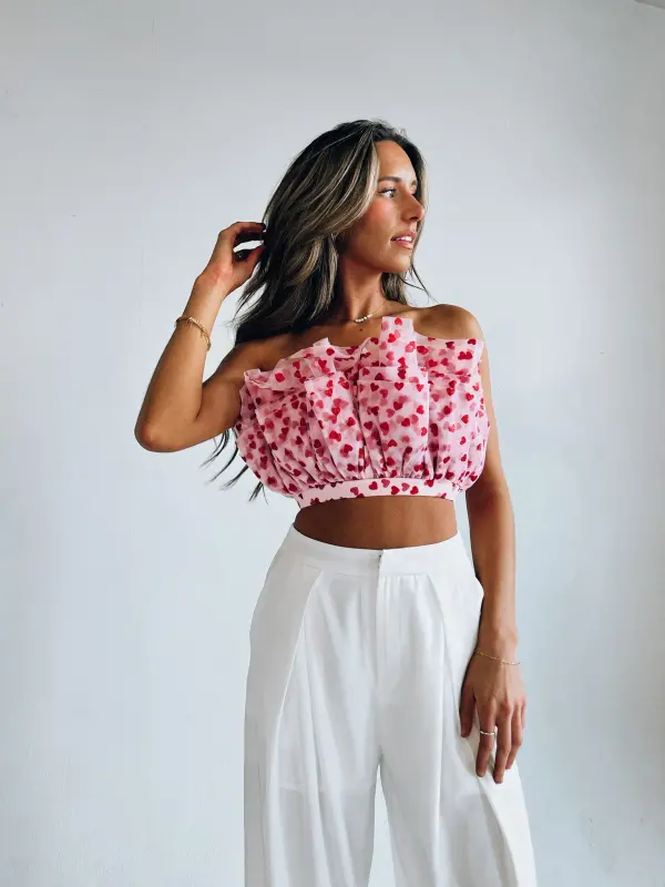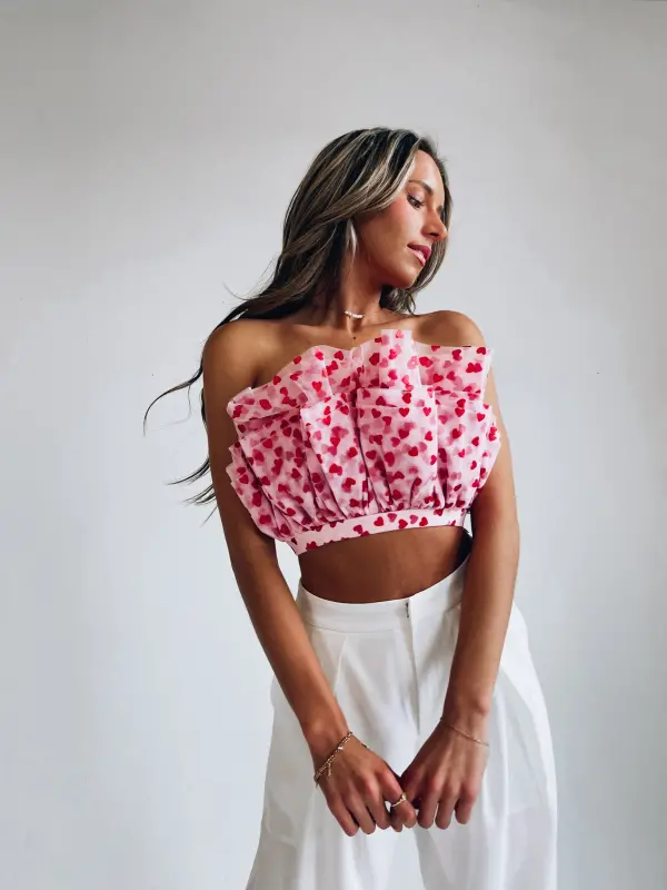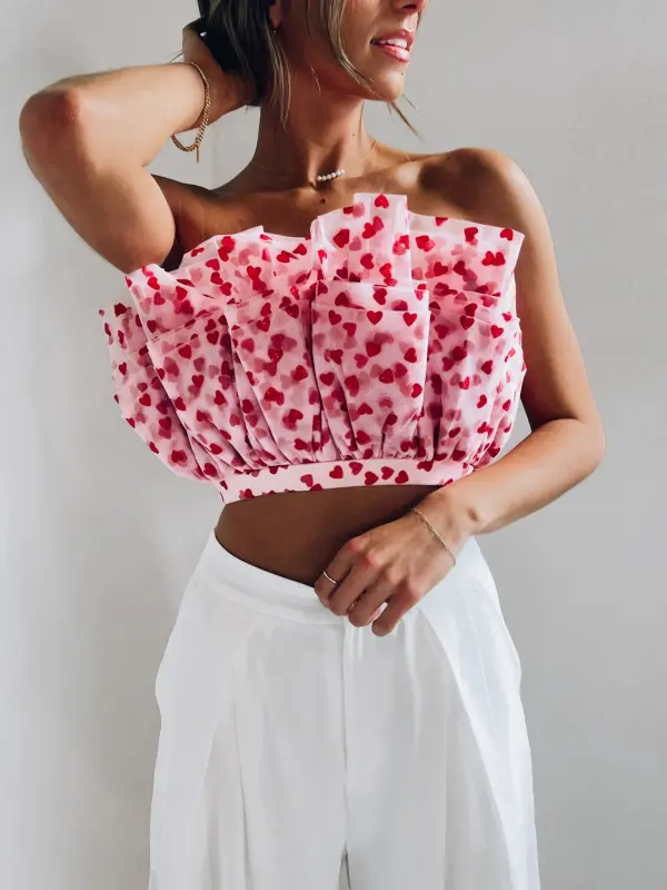 Our Follow Your Heart Top is the festive top you need for any of your Valentines Day plans. This tiered strapless organza top is loaded full of unique details that make this top a total stand out. This top is made of a tiered baby pink organza with red sparkle heart design all throughout. This top is fully lined and is completed with a thick elastic hemline, hidden zipper and hook and eye closure in back, as well as a no slip grip along the neckline. This top has stretch throughout and is true to size but if in between sizes we do recommmend sizing down.