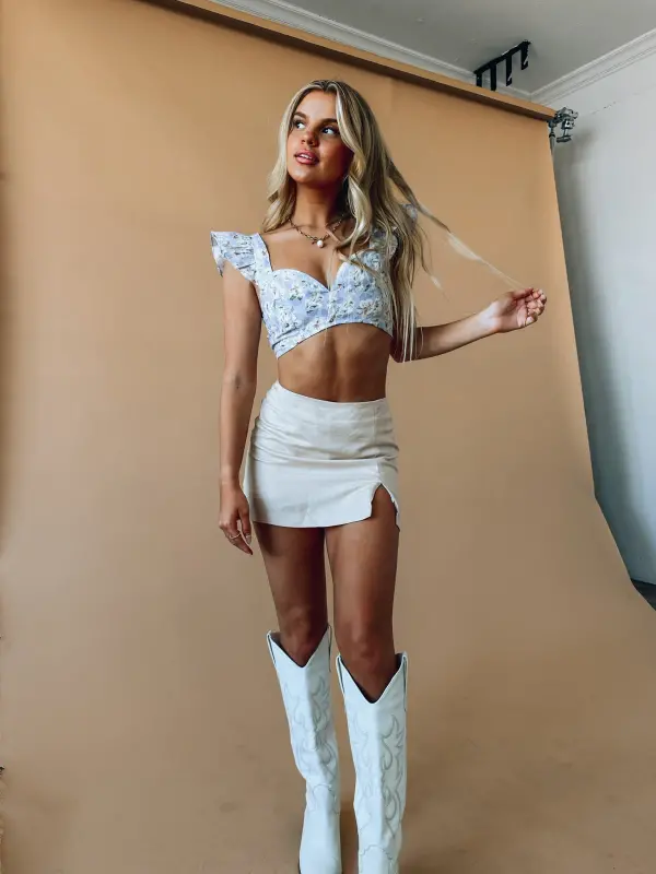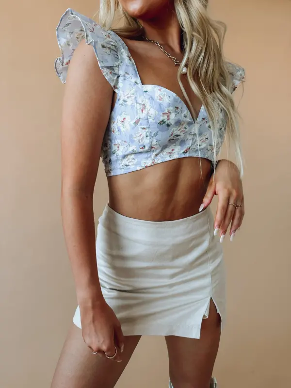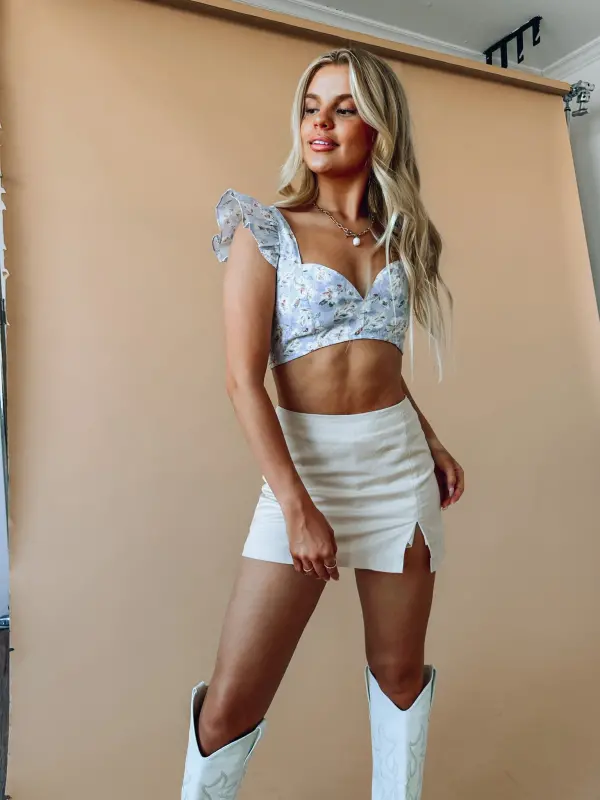 Our Gera Floral Top is a floral crop tank. This top features a low cut sweetheart neckline , ruffle sleeve detail, and smocked back. This top is completed with a beautiful muted multi color floral pattern throughout, rounded hemline, and flattering fit. This top is true to size