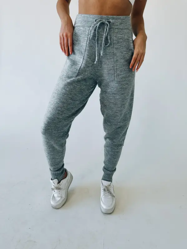 Our Karter Knit Sweatpants have a soft to the touch knitted fabric. These high waisted relaxed fit bottoms have a drawstring elastic waistband. They are a cropped straight leg and the bottom of the pants have a ribbed detail. These are the perfect bottoms to relax in on a lazy day!
