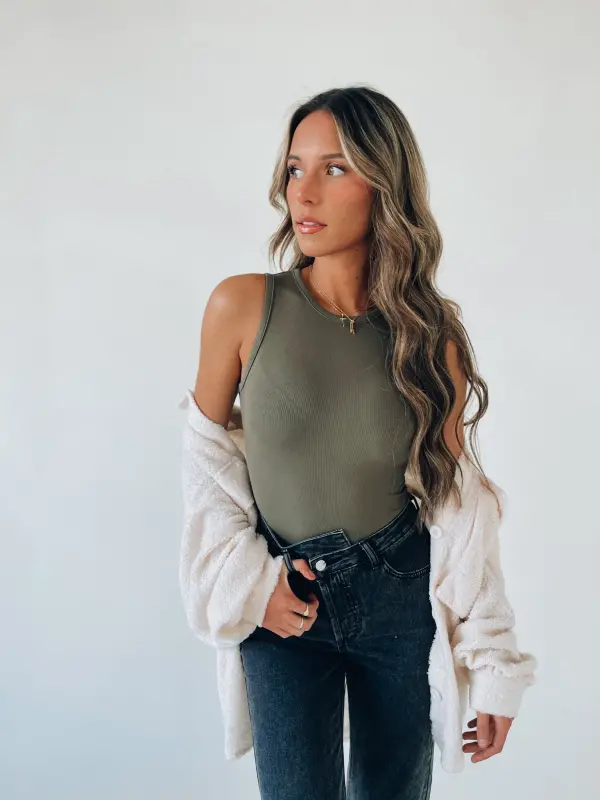 Our Mariah Olive Bodysuit is a fitted, sleeveless boydsuit with a ribbed stretchy fabric. The bottom of this bodysuit has a two snap closure This is the perfect basic bodysuit to throw on with any outfit you have in mind. It has a good stretch in the fabric as well!