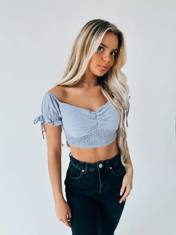 Our Morrilyn Crop Top is an off the shoulder crop top is loaded full of details. This top features a padded bust, smocked bodice, and off the shoulder neckline. The sleeves on this top feature elastic to give the top a more secure fit. This top has a lot of stretch throughtout if in between sizes we recommend sizing up.