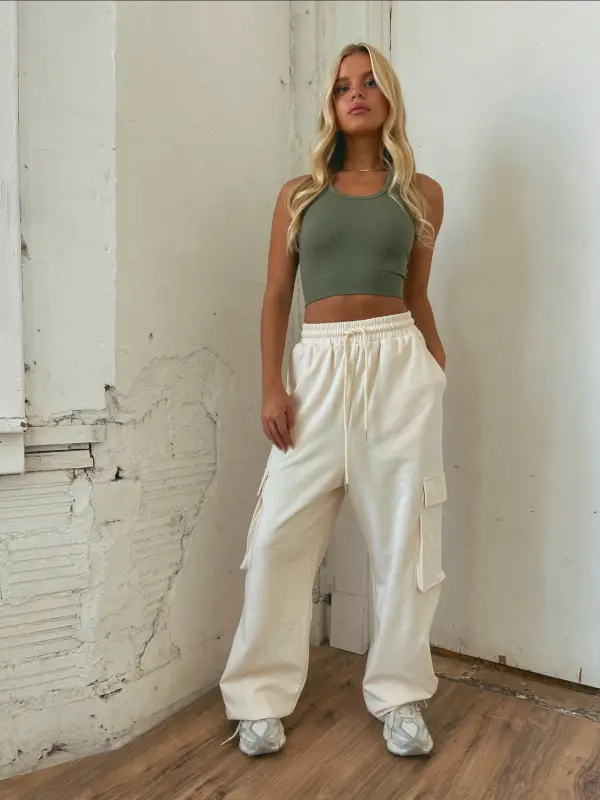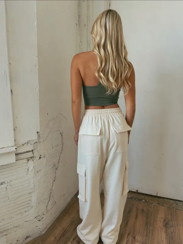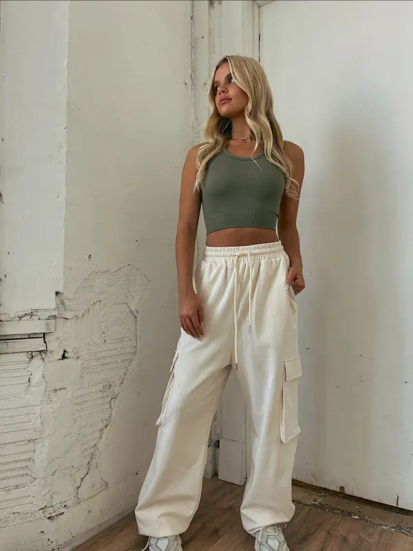 Our Olive Seamless Crop Tank is ribbed tank with a round neckline. This top features a cropped fit, open back, razor back, and ribbed side detail. This top runs true to size and has a ton of stretch throughout.