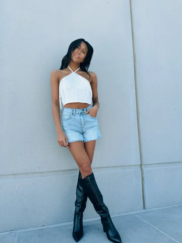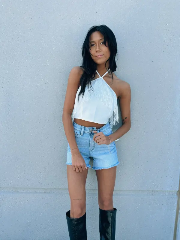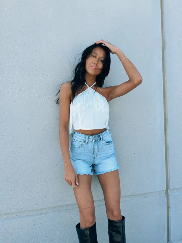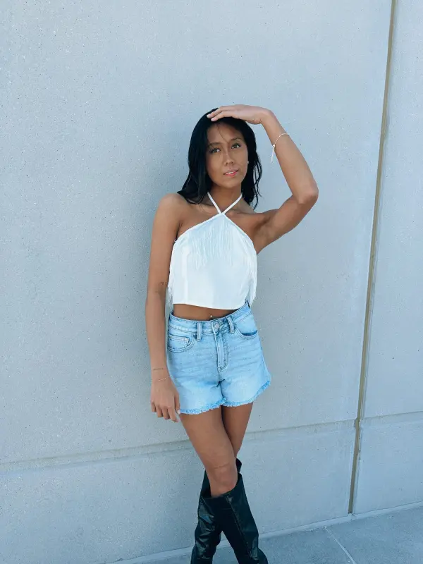 Our Toni Fringe Halter Top is a fitted crop top with a self tie halter neckline. This top features fringe detail across the neckline, self tie nack detail, and cropped fit. The back of this top is super unique with its double self tie back closure and fringe detail.