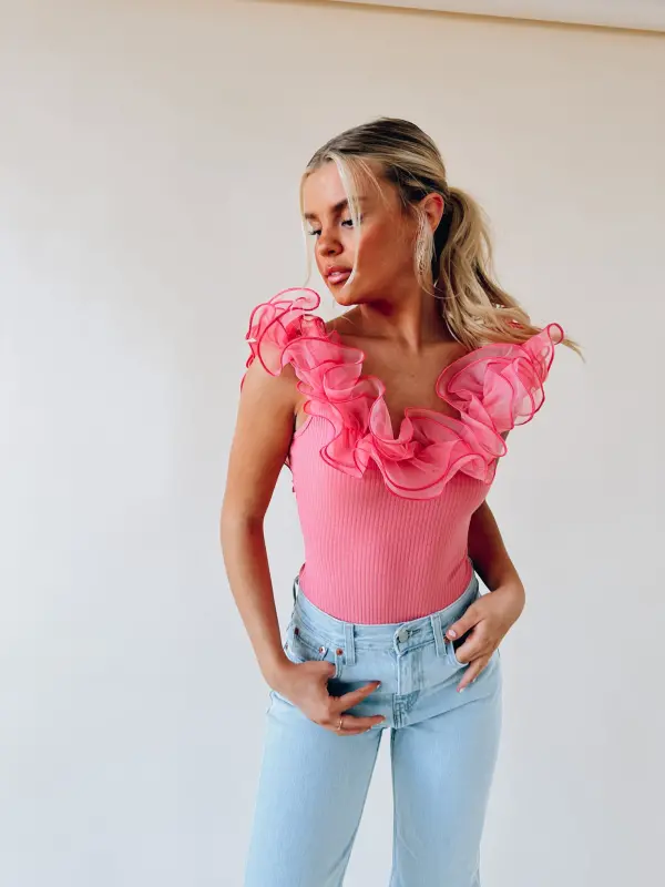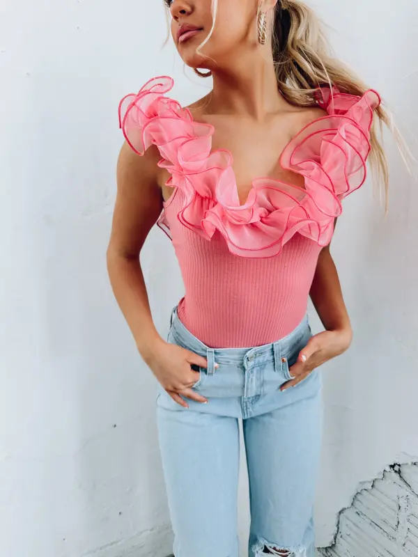Our Wren Ruffle Bodysuit has a fitted ribbed fabric that has a good stretch to it. There is a ruffle organza detail that is around the top, straps, and back. This adorable bodysuit has a bottom snap closure. This can go with any bottom and heel for a cute going out outfit.